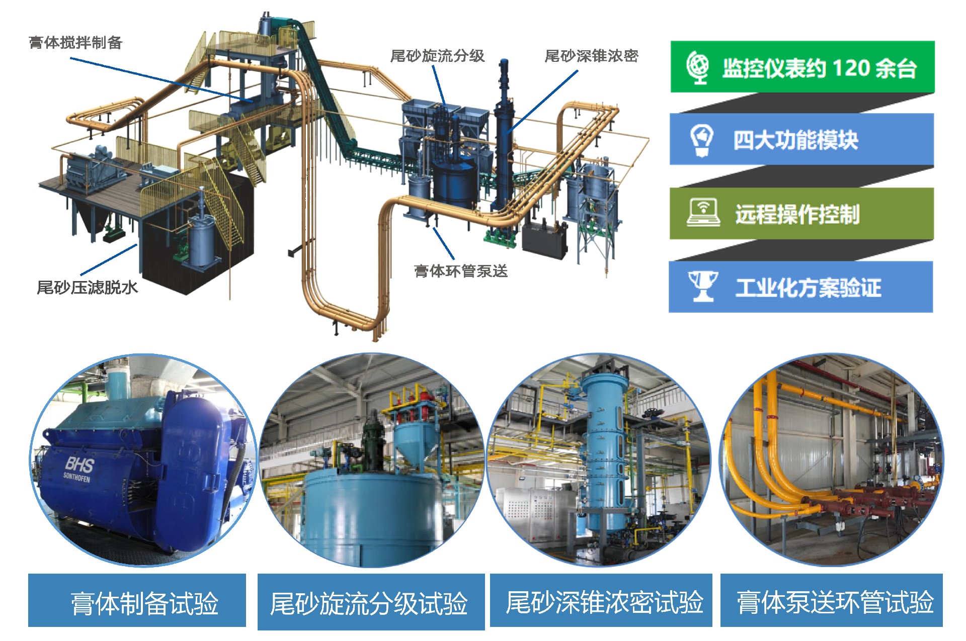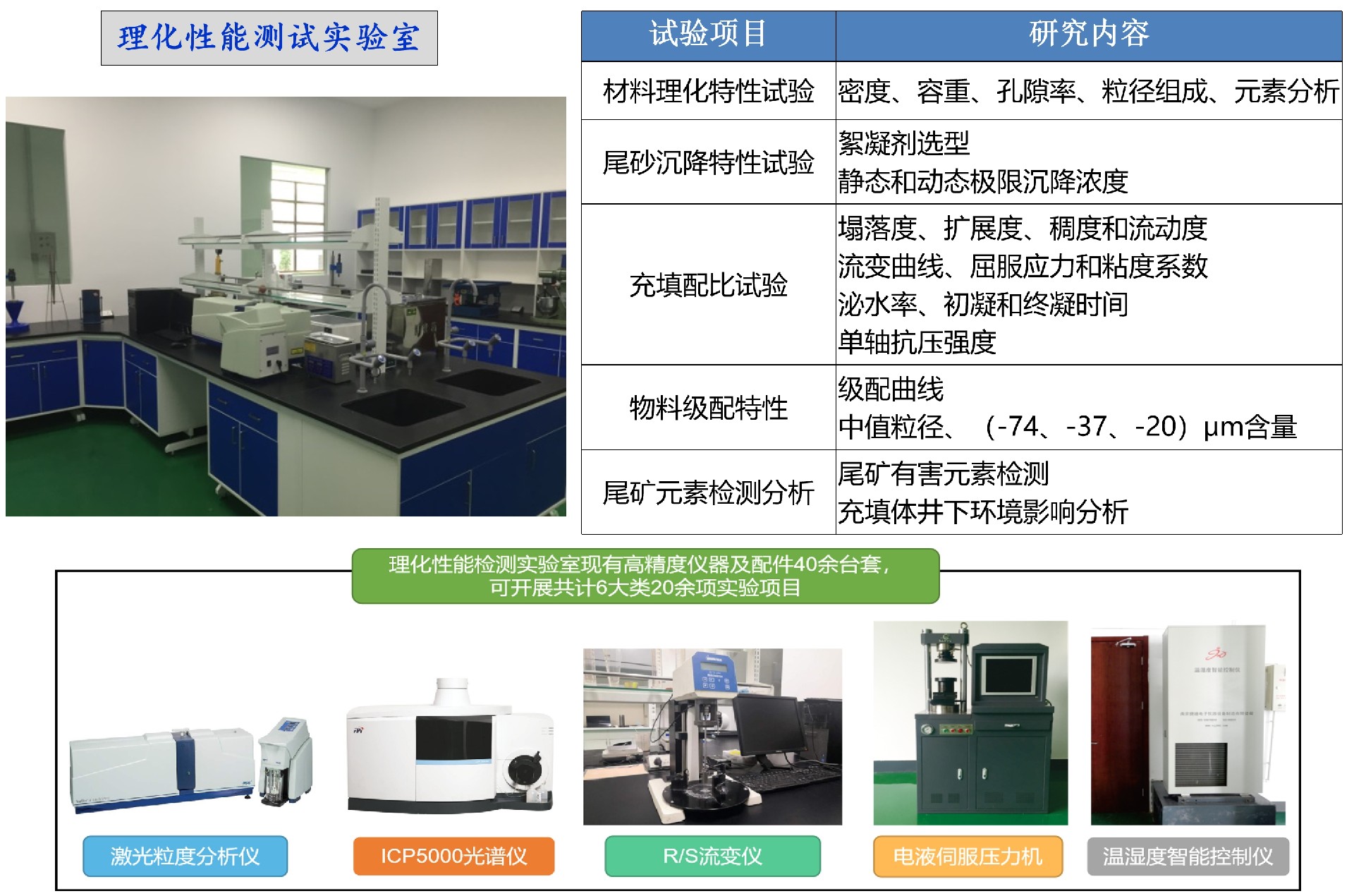 实验基地具备完善的膏体及充填体理化性能检测功能及中试系统,设备齐全、技术先进、功能完善、组织架构规范、运行机制良好、管理制度科学,为矿山充填工艺技术的发展和固废处置领域的科学研究成果转化及人才培养提供支撑平台。